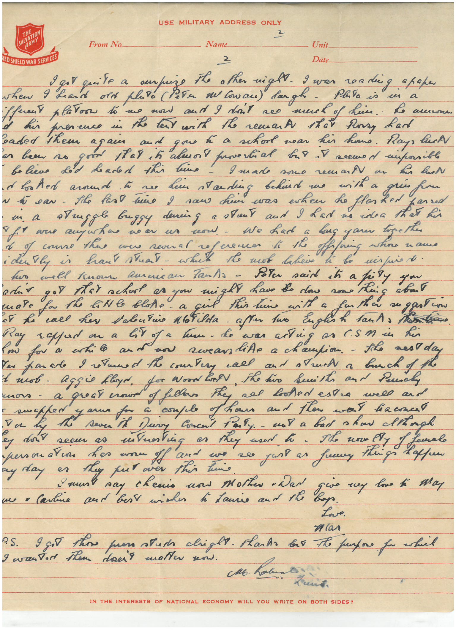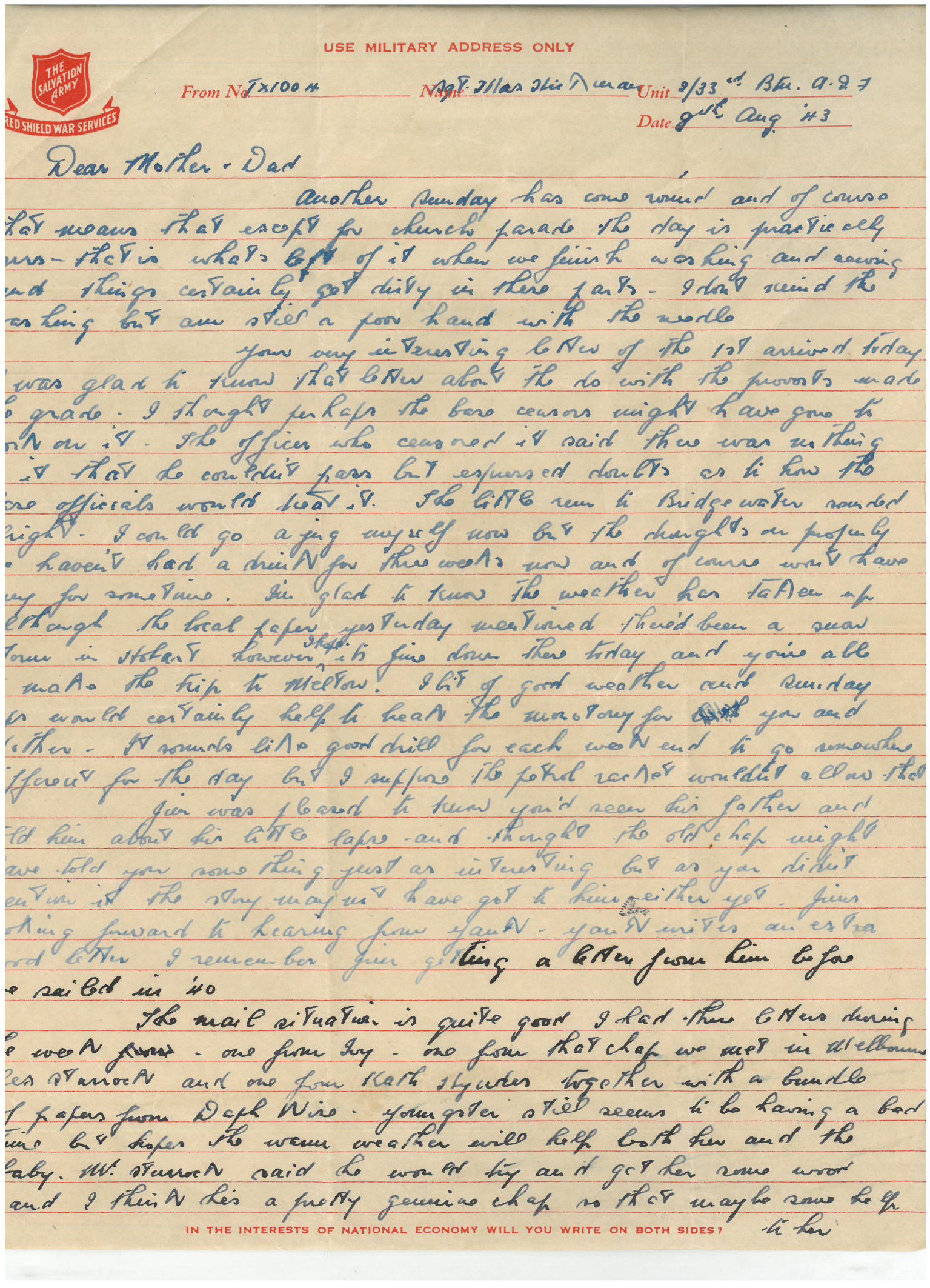 I must say cheerio now Mother & Dad. Give my move to May, Anne & Carline and best wishes to Laurie and the boys.