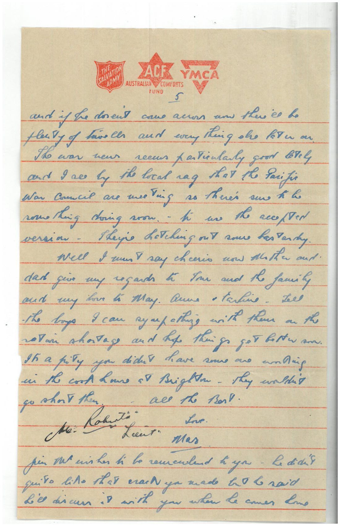 Well I must say cheerio now Mother and Dad. Give my regards to Tom and the family and my love to May, Anne & Carline. Tell the boys I can sympathise with them on the ration shortage and hope things get better soon. It’s a pity you didn’t have someone working int he cookhouse at Brighton – they wouldn’t go short then. All the best.