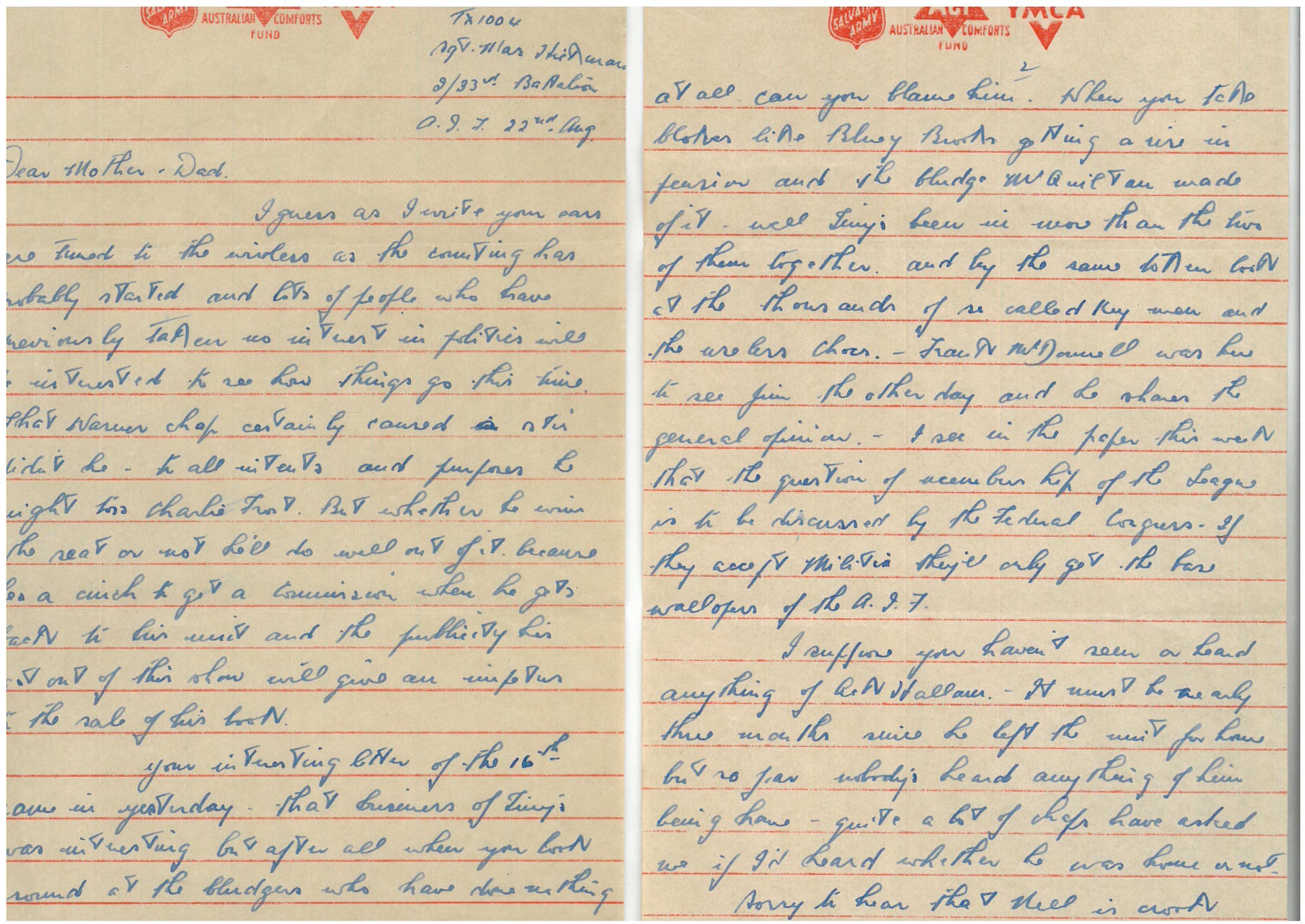 Your interesting letter of the 16th came in yesterday – that business of Tiny’s was interesting but after all when you look around at the bludgers who have done nothing at all, can you blame him. When you take blokes like Bluey Brooks getting a rise in pension and the bludge McQuiltan made of it – well Tiny’s been in more than the two of them together and by the same token look at the thousands of so called key men and the useless choc’s. Frank McDonnell was here to see Jim the other day and he shares the general opinion. I see in the paper this week that the question of membership of the League is to be discussed at the Federal Congress. If they accept Militia they’ll only get the base wallopers of the AIF.