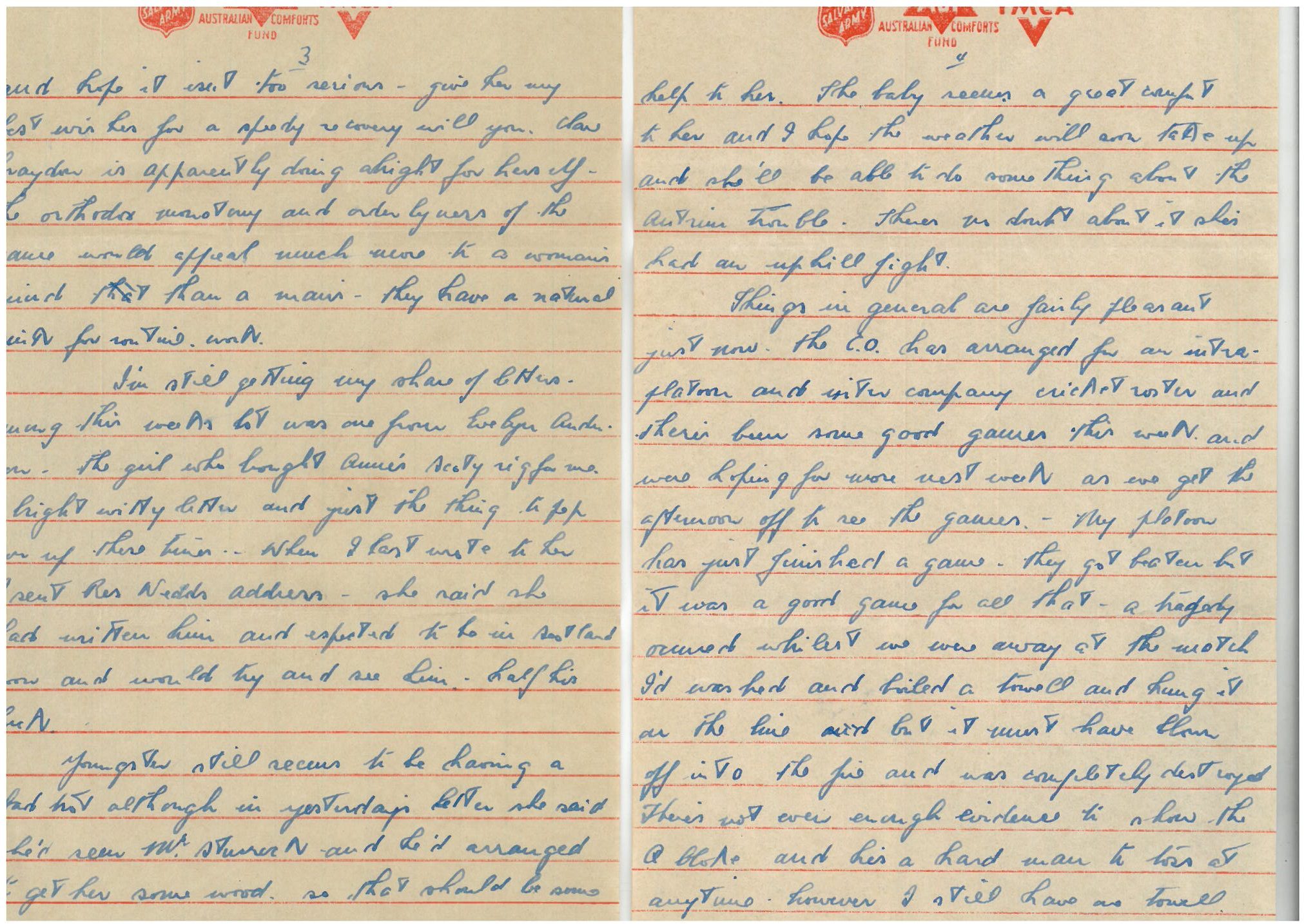Things in general are fairly pleasant just now. The CO has arranged for an intra-platoon and inter-company cricket roster and there’s been some good games this week and we’re hoping for more next week as we get the afternoon off to see the games. My platoon has just finished a game – they got beaten but it was a good game for all that. A tragedy occurred while we were away at the match: I’d washed and boiled a towel and hung it on the line but it must have been blown off into the fire and was completely destroyed. There’s not even enough evidence to show the bloke and he’s a hard man to toss at any time. However I still have a towel and if he doesn’t come across now there’ll be plenty of towels and everything else later on.