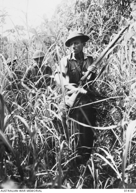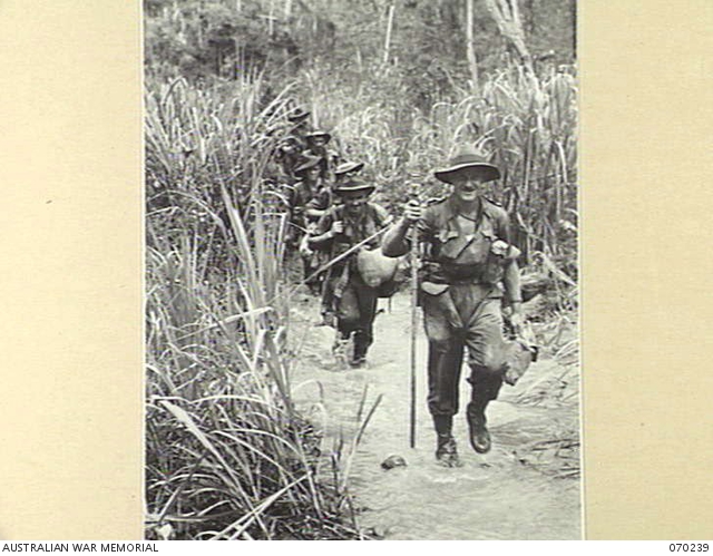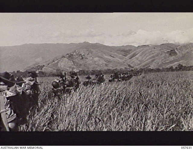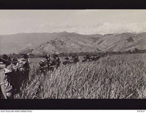 On 31 August the unit set off on a four day brigade advance-exercise west beyond Moresby. The exercise covered nearly 65 miles there and back through undulating kunai and swamp. It was planned to simulate the Lae track from Nadzab, though not all the troops were aware of this. For the troops it was a hard, testing and gruelling four days. The exercise tested the supply services, communications, the deployment of both companies and support platoons, and of the battery of artillery we had with us. It was a fitting and successful culmination of all we had trained for prior to the exercise. Overall, Brigadier Eather was pleased, as was Lt-Col Cotton. However, on the return march – some 28 miles, of which 14 was carried out after dark, some 108 men fell out, over half of them within six miles of camp. The CO stood at the roadside to watch the unit file past to the tents and he was very displeased at the number of drop-outs. However John Follent the MO assured the CO that 90 percent of them were legitimate hear exhaustion cases. The weather at the time was the hottest experienced in Moresby for some years. Like most exercises, when compared to actual operations, this one was particularly gruelling….