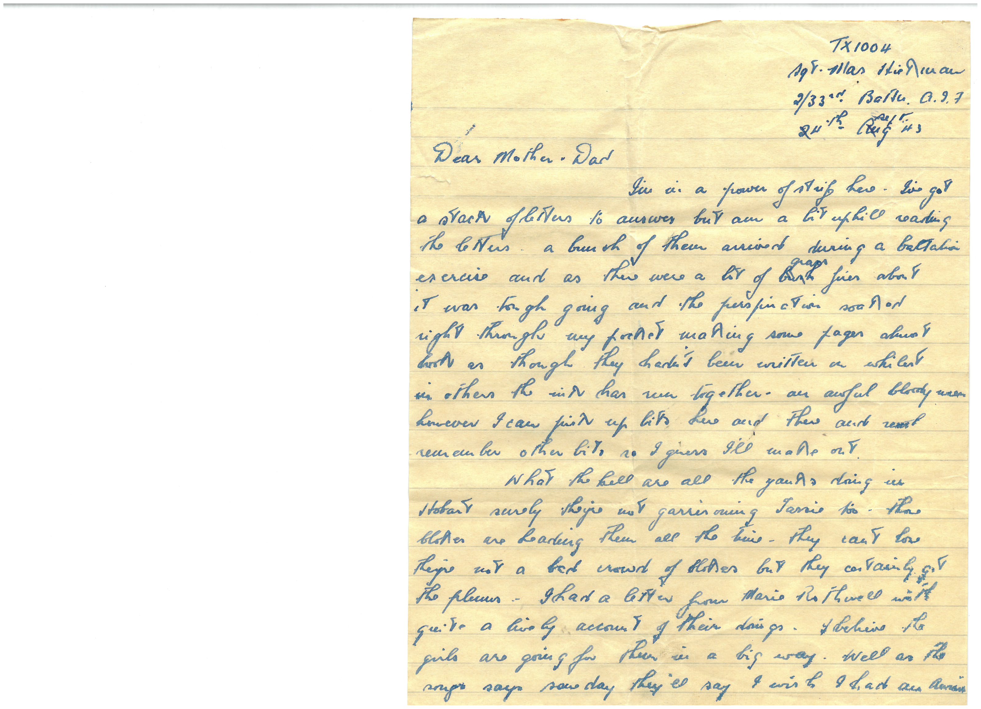 I’m in a power of strife here. I’ve got a stack of letters – a bunch of them arrived during a battalion exercise and as there were a lot of grass fires about it was tough going and the perspiration soaked right through my pocket making some pages almost look as though they hadn’t been written on whilst in others the ink has run together – an awful bloody mess. However I can pick up bits here and there and remember other bits so I guess I’ll make out.