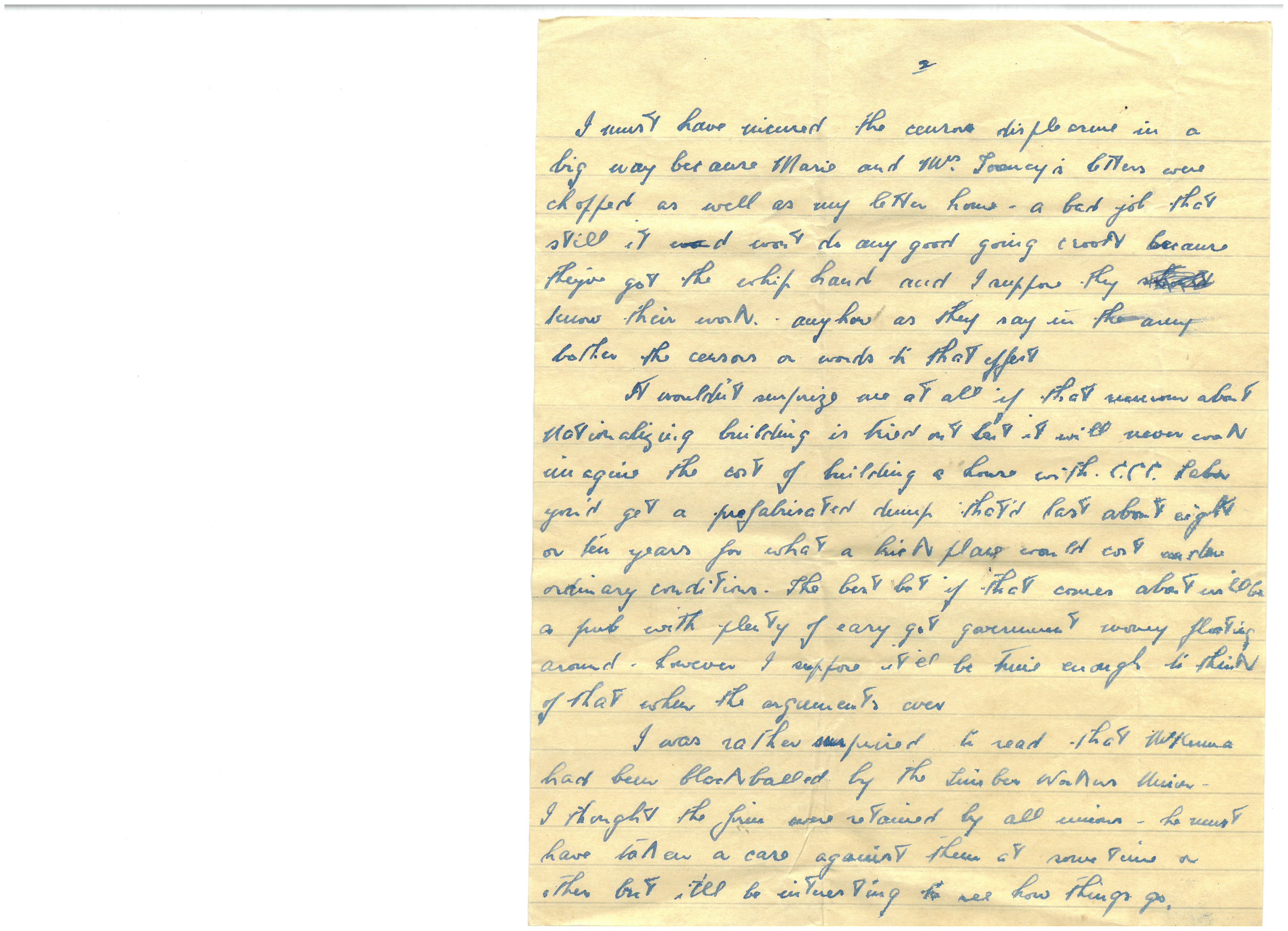 It wouldn’t surprise me at all if that rumour about nationalising building is tried out but it will never work. Imagine the cost of building a house with CCC labour – you’d get a prefabricated dump that’d last about eight or ten years for what a brick place would cost under ordinary conditions. The best bit if that comes about will be a pub with plenty of ways got government money floating around. However I suppose it’ll be time enough to think of that when the argument’s over.