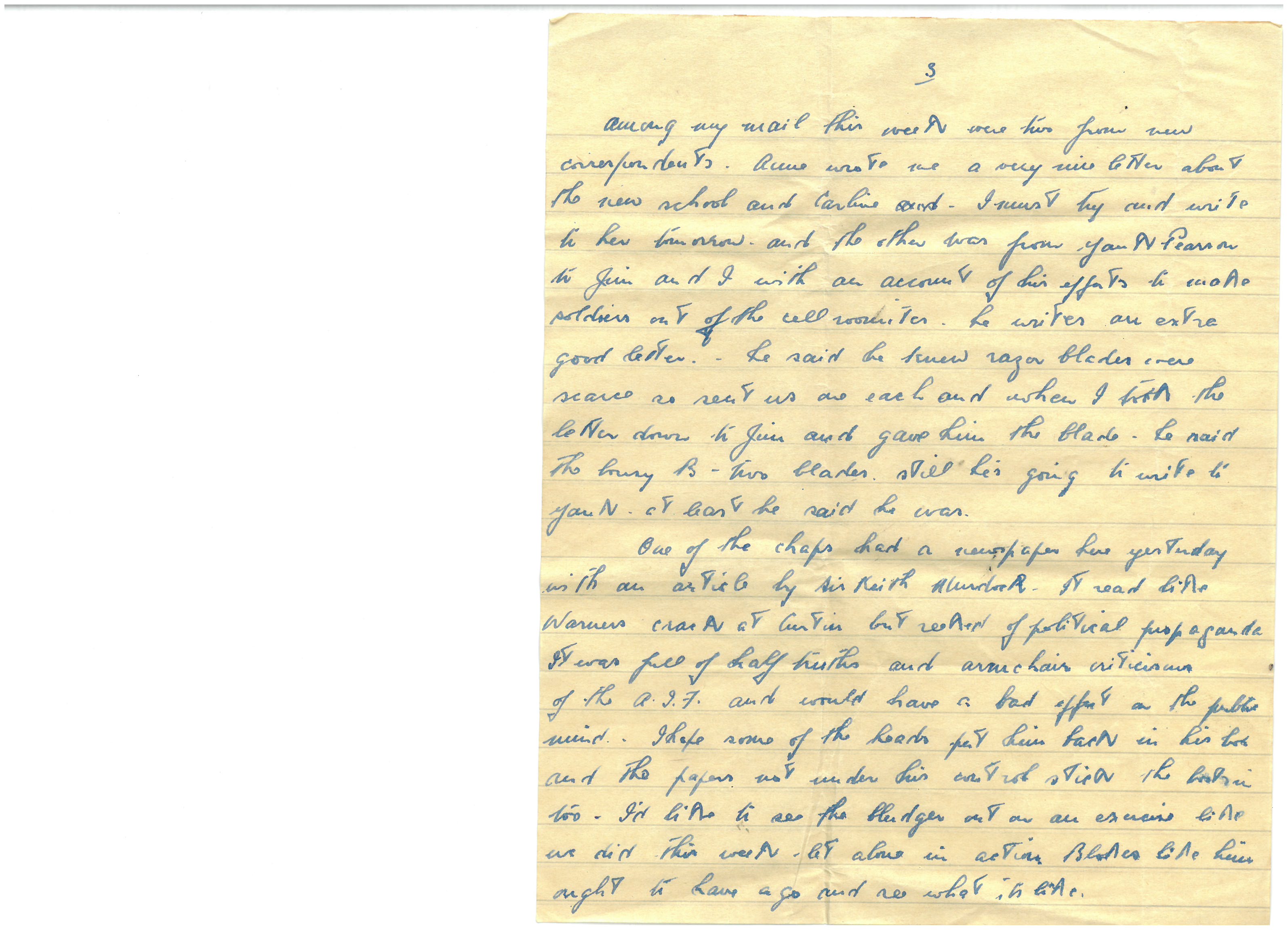 Among my mail this week were two from new correspondents. Anne wrote me a very nice letter about the new school and Carline – I must try and write to her tomorrow and the other was from Yank Pearson to Jim and I with an account of his efforts to make soldiers out of the cell roomites(?). He writes an extra good letter. He said he knew razor blades were scarce so sent us one each and when I took the letter down to Jim and gave him the blade, he said the lousy B – two blades – still he’s going to write to Yank – at least he said he was.
