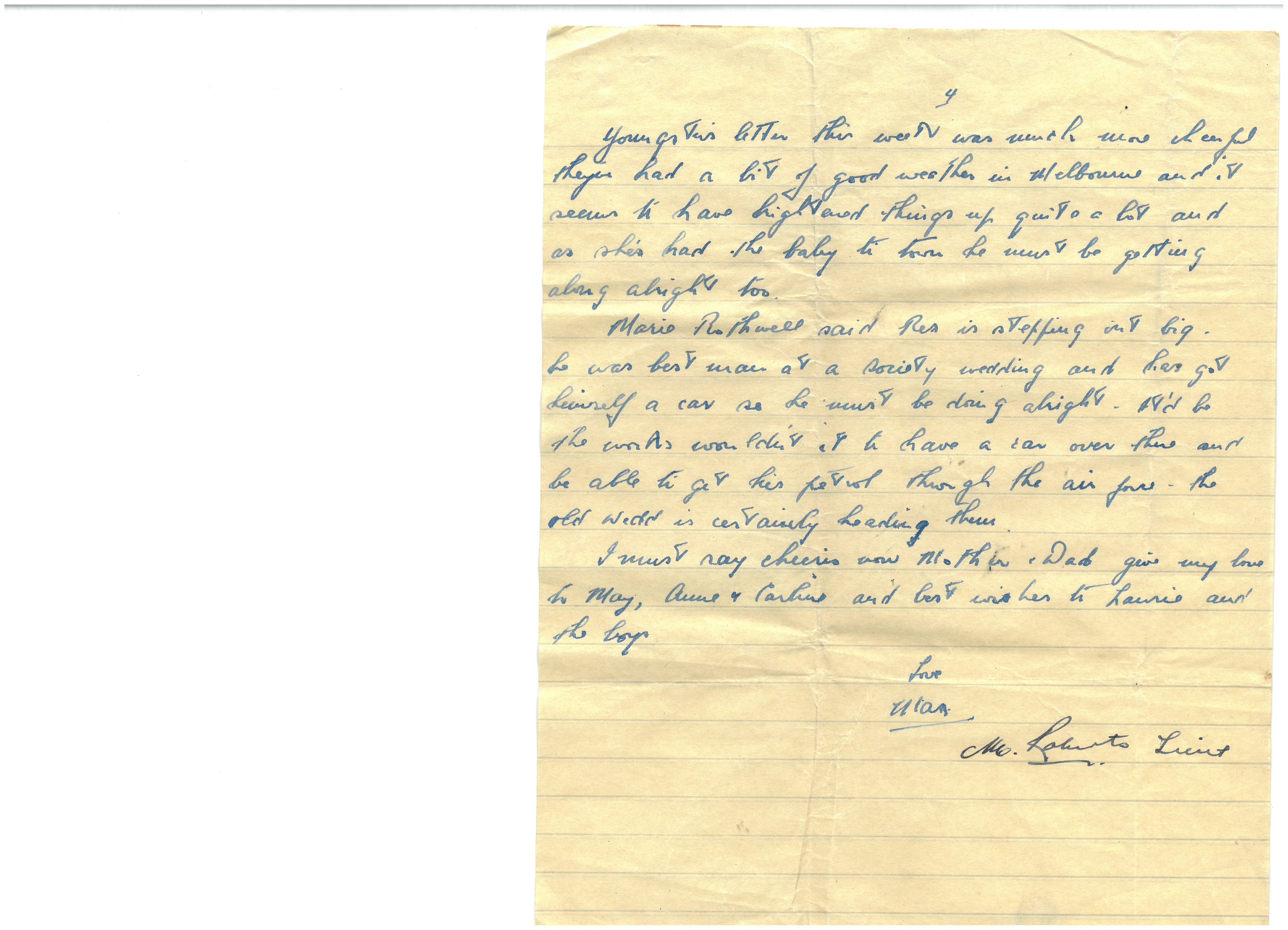 I must say cheerio now Mother & Dad- give my love to May, Anne & Carline and best wishes to Laurie and the boys.