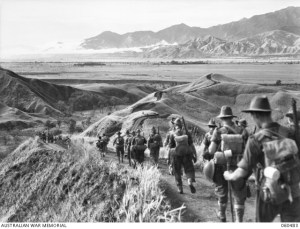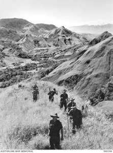 Troops of B company 2/27th Australian Infantry Battalion walking along the ridge at Guy’s Post, overlooking the Faria River…