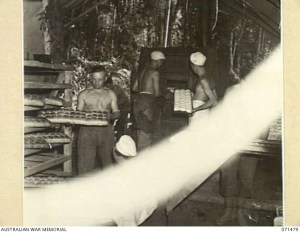 An Australian Field Bakery working at Guy’s Post. (Not the bakers referred to in the extract above, but I imagine that like these bakers, those attached to the 25th Brigade also turned out some 6000 buns per day)