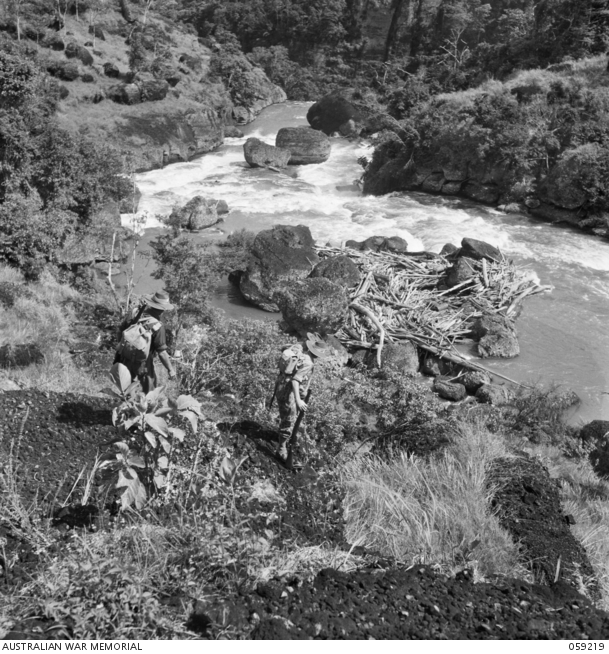 A patrol of the NGF Training School (Jungle Wing) at the edge of the Laloki River near the Rouna Falls.
