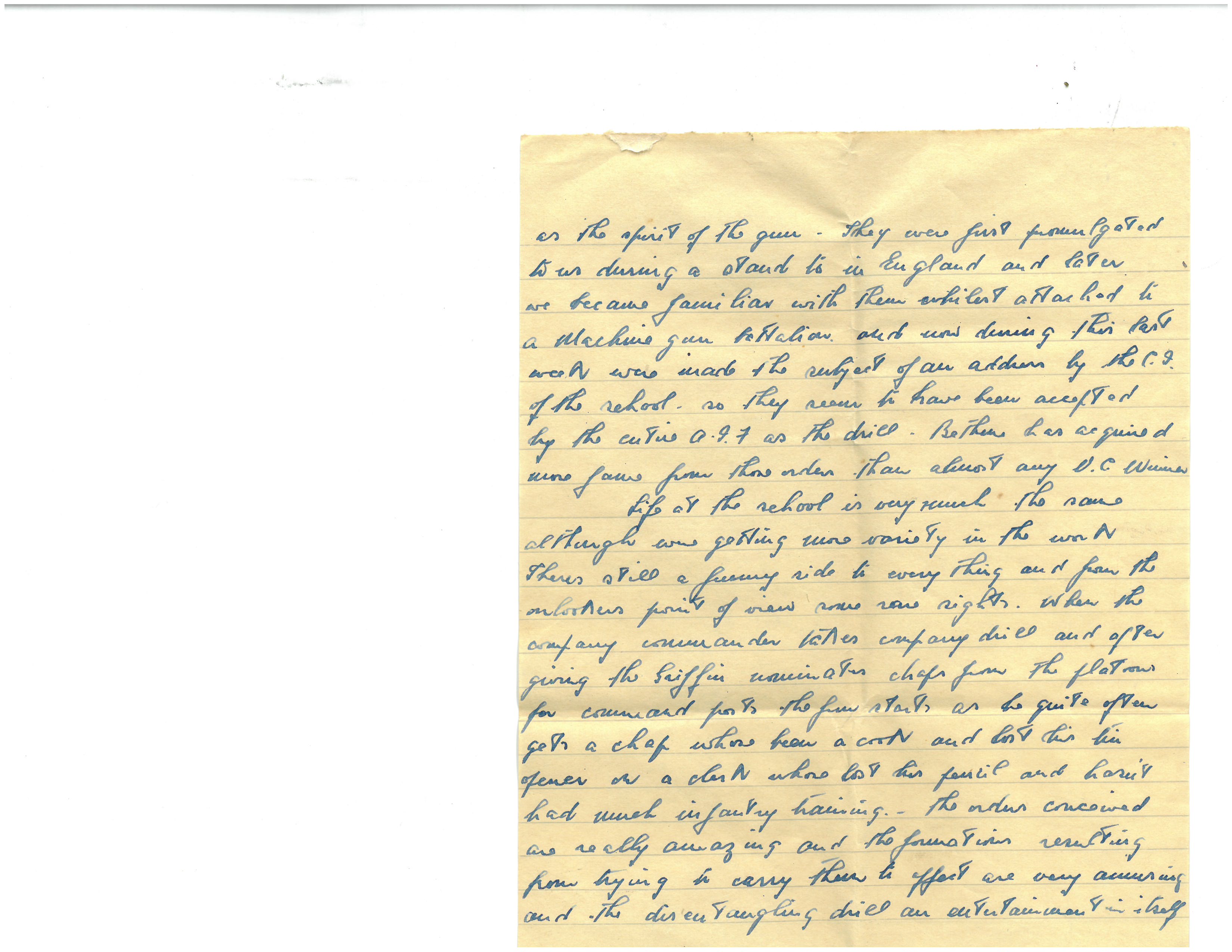 Life at the school is very much the same although we’re getting more variety in the work. There’s still a funny side to everything and from the onlookers’ point of view some rare sights. When the company commander takes company drill and after giving the Griffin nominates chaps from the platoons for command posts, the fun starts as he quite often gets a chap who’s been a cook and lost his tin opener or a clerk who’s lost his pencil and hasn’t had much infantry training. The orders conceived are really amazing and the formations resulting from trying to carry them to effect are very amusing and the disentangling drill an entertainment in itself.