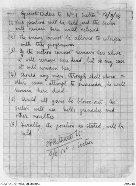 According to a tribute in the Sydney Morning Herald, 5 December 1942 (https://monumentaustralia.org.au/themes/people/military/display/102121-captain-frank-bethune) Captain Frank Pogson Bethune, who died yesterday, was the author of a famous order to his troops in France in the last war. He was a Church of England minister when he enlisted as a private in 1915. His order is quoted in Dr. Bean’s Official History of the A.I.F. The position that Captain Bethune, then a lieutenant, was told to hold was regarded by him as a “useless deathtrap.” Unable to convince his superior officer, he demanded that he should be allowed to justify his opinion by holding the post himself. This was agreed to. He told his section what he thought of the place, and the circumstances, and asked for volunteers. Every man volunteered, and he issued the following order: