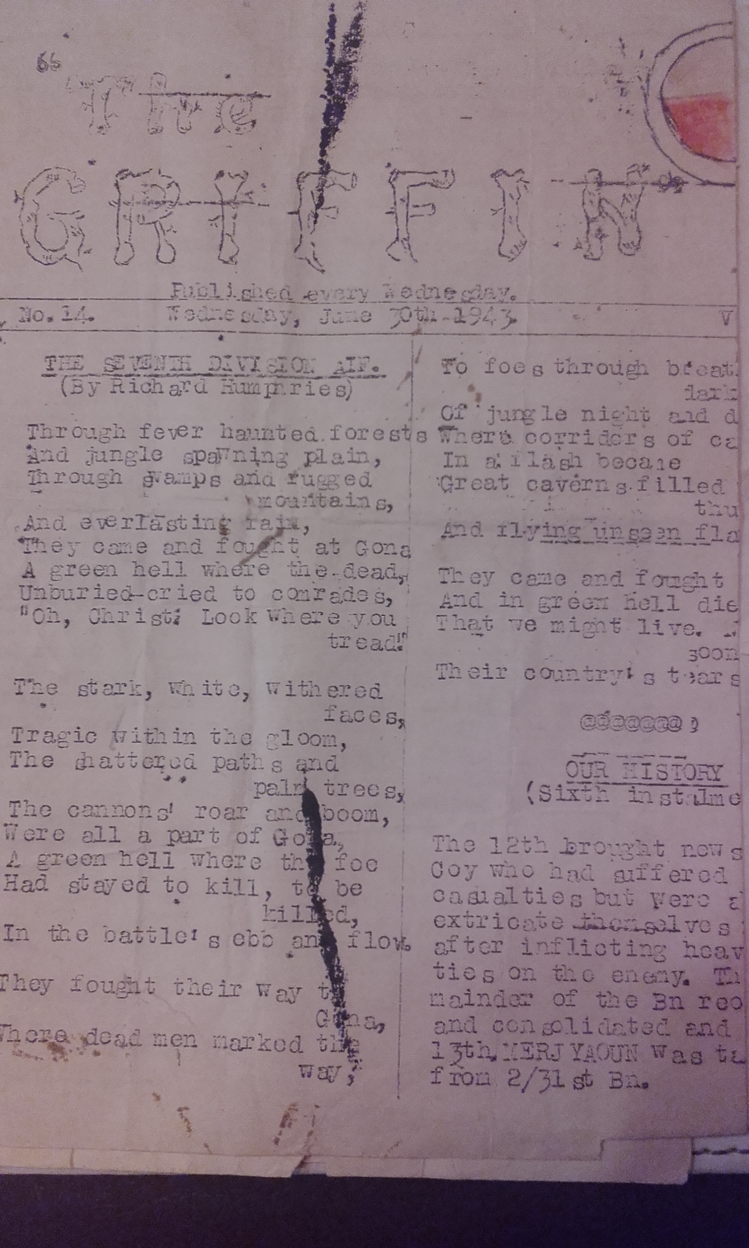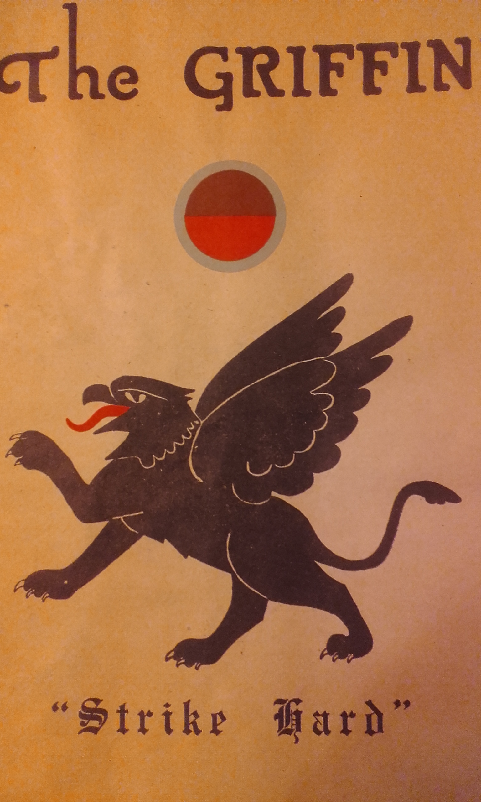In The Footsoldiers (p431) , a list of expressions described as ‘Quips and Howlers’ includes The Griffin: What’s cooking’, the good oil, what do you know? and the great ‘They say’. The Griffin was also the name chosen for the unit newsletter which was published ‘nearly every week when out of action’ by the Intelligence Section. The first edition was dated 31 March 1943. Generally, these were very modest affairs, but occasionally a ‘special edition’ was produced more professionally, with a strong cover emblazoned with the crest adopted as the unit emblem – and the motto ‘Strike Hard’.