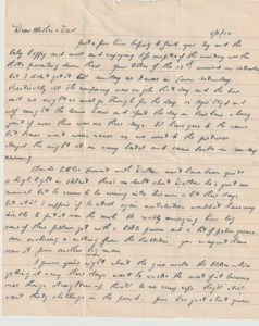 Got quite a healthy bunch of letters when we arrived back in camp last night after a three day stunt – four in all. Yours, dad’s, & one each from Marie & Jack – a widely varied and interesting selection. Glad to hear you’ve reached the ancestral domicile safely and that the crossing was good even if the train trip wasn’t the best. I’ll bet the mater & pater were pleased to see you and the little bloke and May and the children too – can well imagine the little bloke and Carline making a hit. They’ll have fun between them. Even though conveniences are somewhat lacking you should be quite comfortable during your stay as I know Mother & Dad will do their utmost to make you so, and as dad’s got plenty of wood in you’ll at least have warmth.