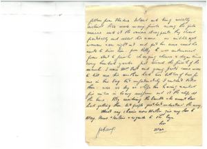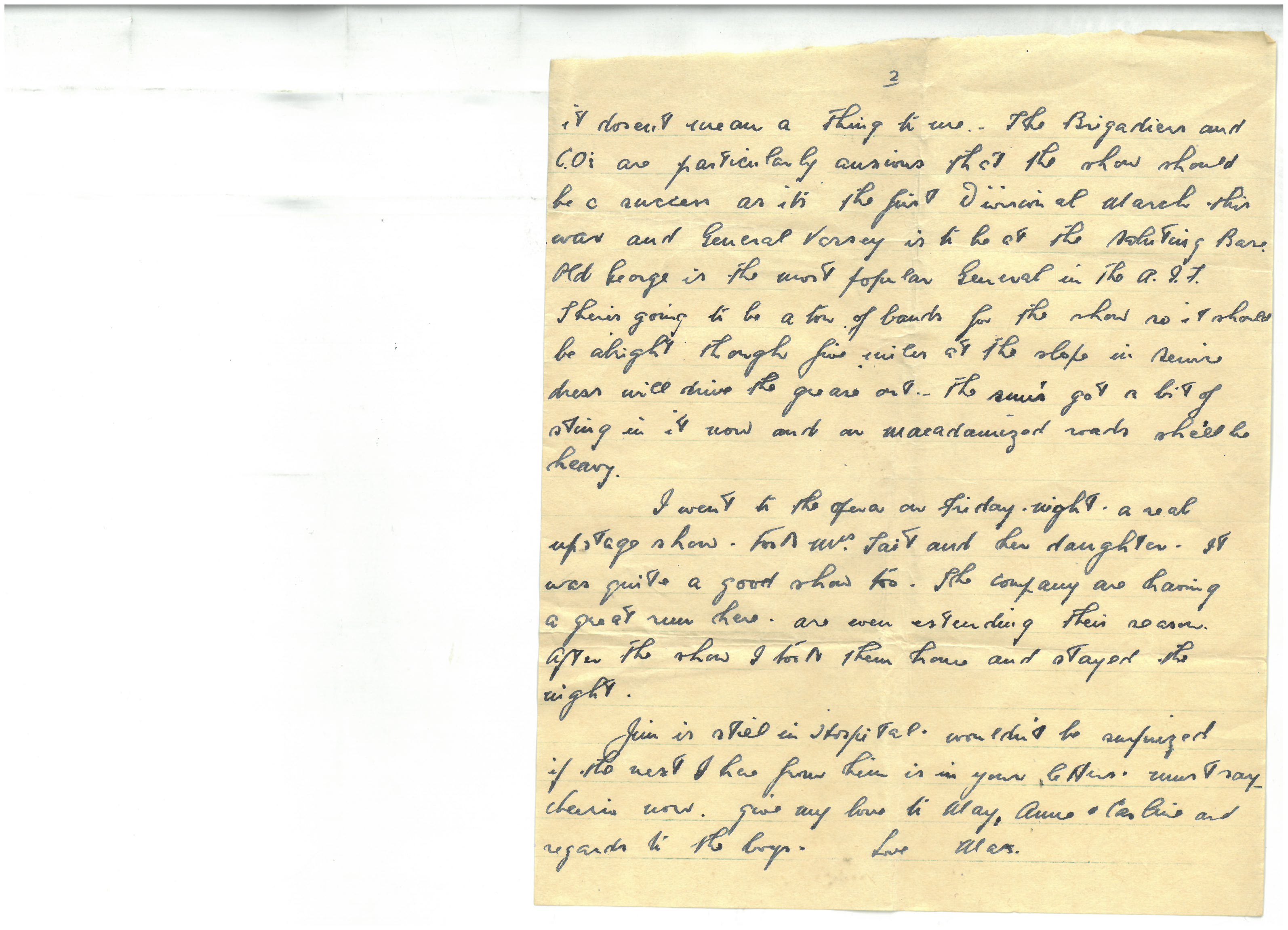 Jim is still in Hospital. Wouldn’t be surprised if the next I hear from him is in your letters . Must say cheerio now. Give my love to May, Anne & Carline and regards to the boys.