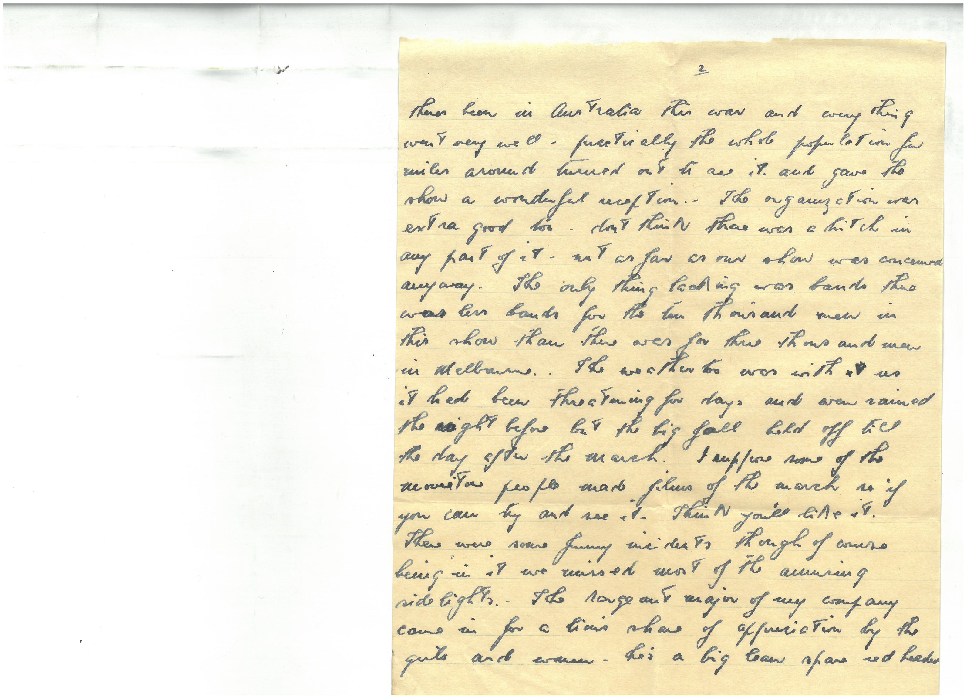 We’ve had quite a big week here what with the divvy march and one thing and another. The march was a great success – the biggest there’s been in Australia this war and everything went very well – practically the whole population for miles around turned out to see it and gave the show a wonderful reception. The organisation was extra good too. Don’t think there was a hitch in any part of it – not as far as our show was concerned anyway. The only thing lacking was bands – there was less bands for the ten thousand men in this show than there was for three thousand men in Melbourne. The weather too was with us : it had been threatening for days and even rained the night before but the big fall held off till the day after the march. I suppose some of the movie tone people made films of the march so if you can, try and see it. Think you’ll like it. There were some funny incidents though of course being in it we missed most of the amusing sidelights. The sergeant major of my company came in for a lion’s share of appreciation by the girls and women – he’s a big lean spare red headed fellow from Flinders Island and being socially inclined has made many friends among the girls services – and at the various strong points they cheered frantically and called his name. One middle aged woman ran right out and put her arms round his neck to kiss him. Poor Robby was embarrassed from start to finish, changing colours a dozen times every hundred yards. Just toward the finish of the march I saw Mrs Tait and young Jack came over to tell me his mother had two bottles of beer for me in her bag but unfortunately I couldn’t take them – was as dry as chips too, having marched five miles in heavy uniform and at the slope all the time. Pity considering the trouble she must have had getting them – but people just don’t understand the army.