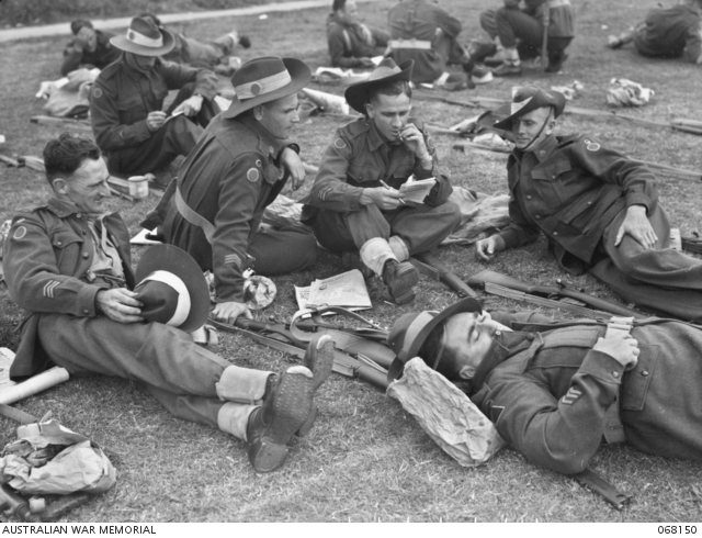 This photo shows troops of the 25th Brigade (battalion not identified) relaxing in the assembly area at Victoria Park while waiting for the order to fall in.