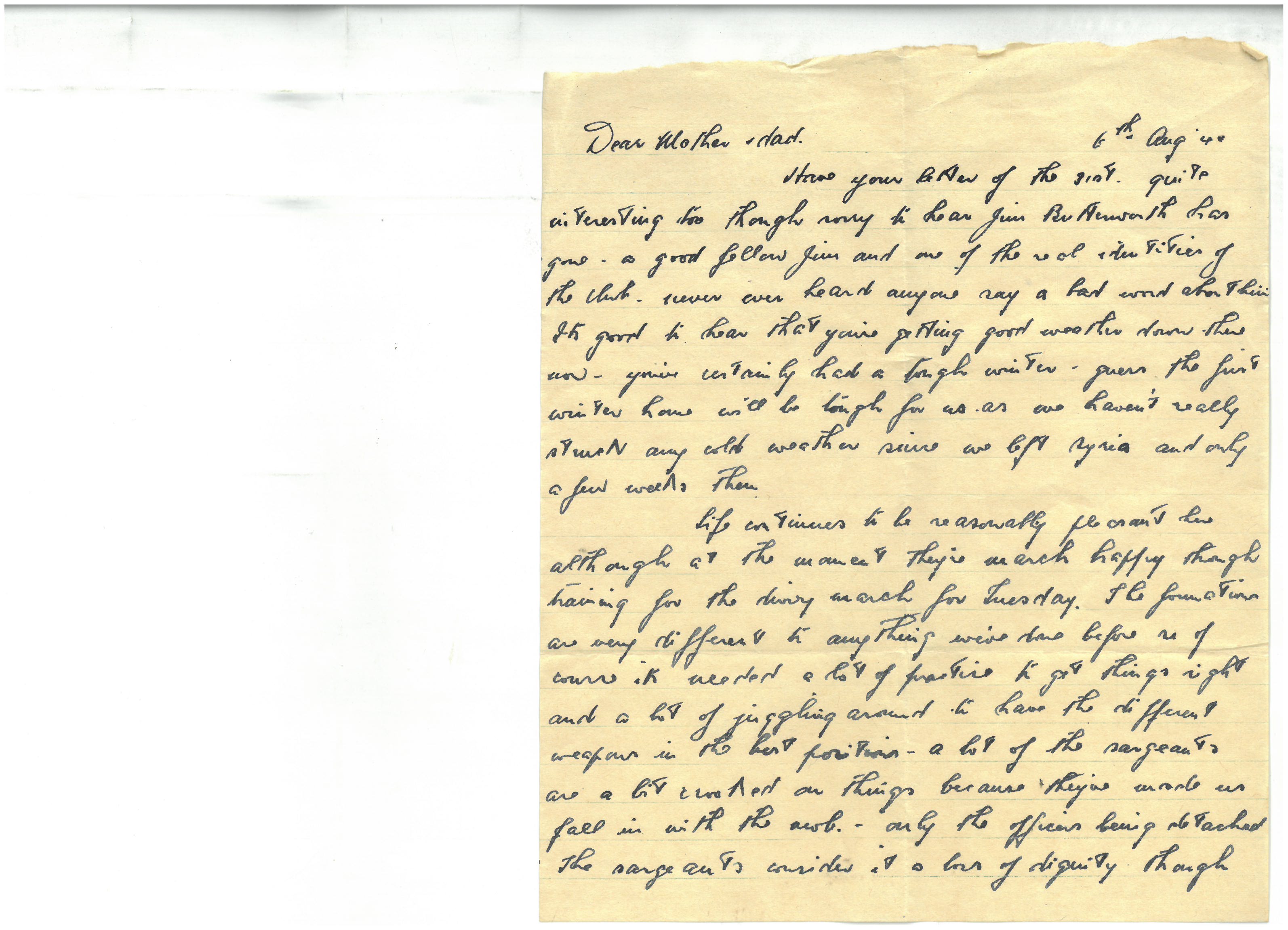 Have your letter of the 31st – quite interesting too though sorry to hear Jim Butterworth has gone – a good fellow Jim and one of the real identities of the Club. Never heard anyone say a bad word about him. It’s good to hear that you’re getting good weather down there now – you’ve certainly had a tough winter – guess the first winter home will be tough for us as we haven’t really struck any cold weather since we left Syria and only a few weeks then.