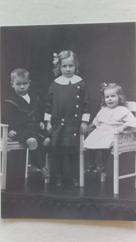 At the time of his marriage to May Jackson on April 25th, 1907 (not a significant date at that time) Henry was described as an orchardist.   When he volunteered for service in ‘the European War’ in March 1915, he was described as a labourer aged 33. This photo of Dad and his two sisters was taken at that time – Dad was just 4, his older sister May was 6 and Ivy – often referred to in his letters as ‘Youngster’ – was 2.