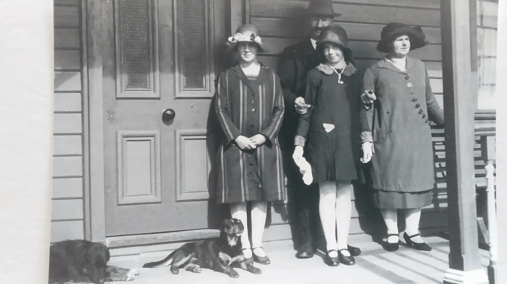 The photo below was taken by Max in about 1925. The location is 51 Giblin St, which was their home at the time. By the time he enlisted in 1940 they were living in Pottery Road. (That house was destroyed in the 1967 bushfires, by which time they had moved to Courtney St.)  Older sister May is in the striped coat with Ivy being held by her father. The family dogs were referred to in Dad’s letters as ‘the troops’ or ‘the boys’.