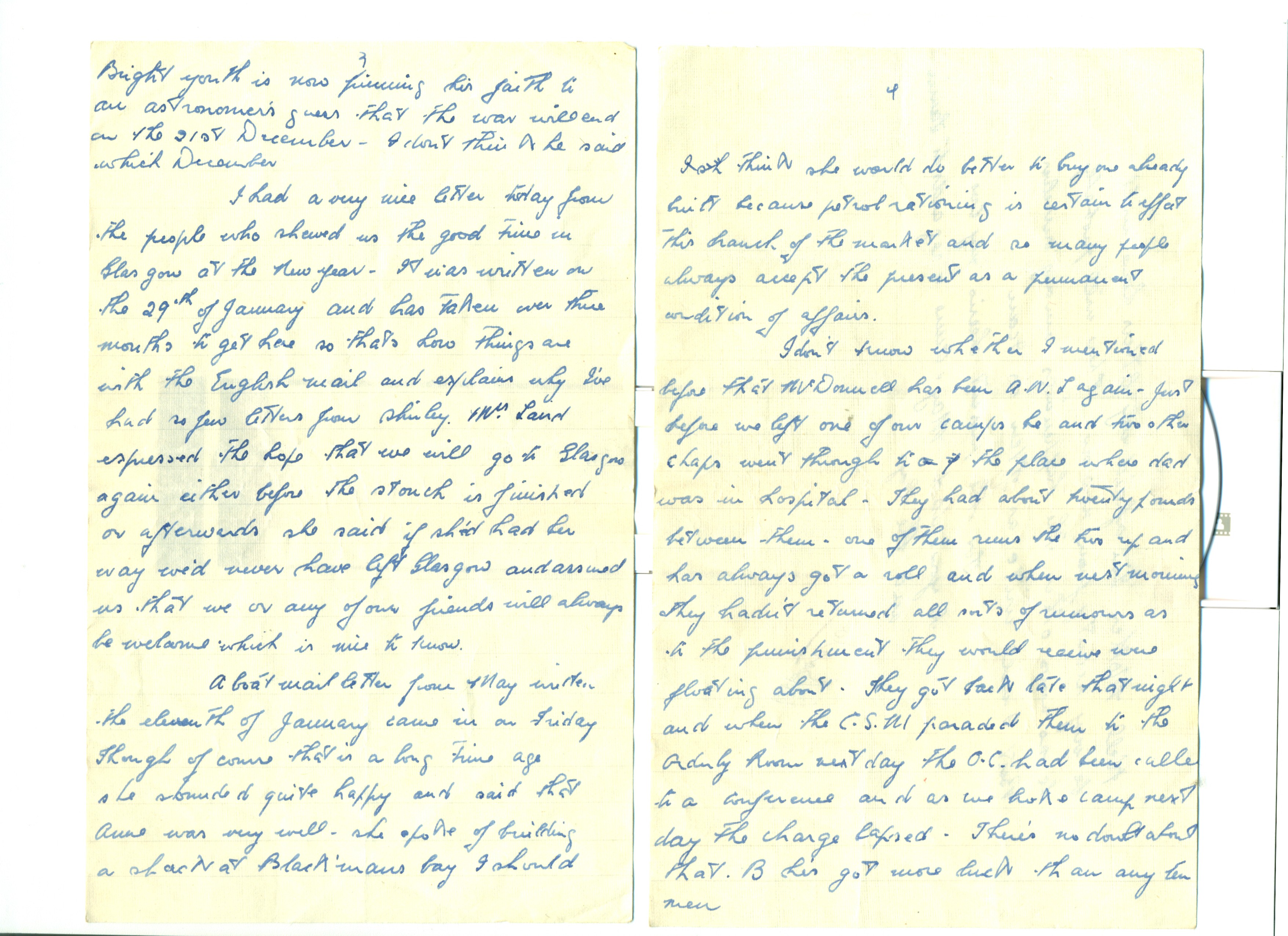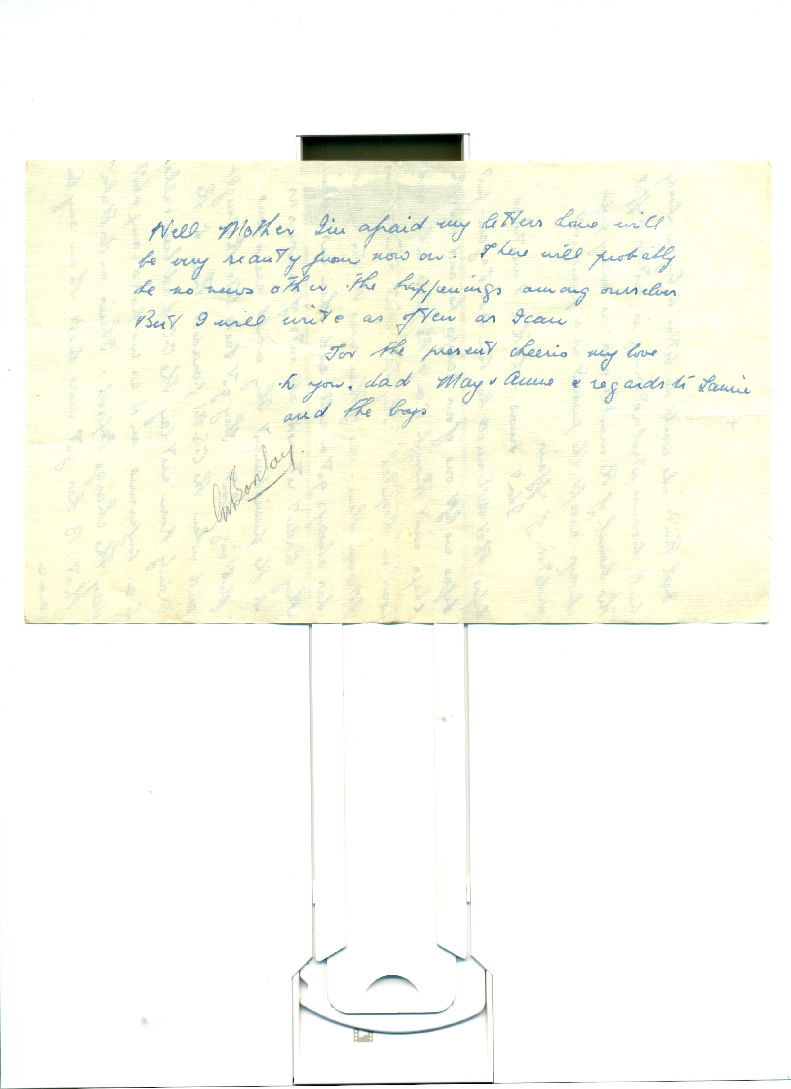 Billie Laird was the young lady who invited Dad and his friend Graham Watts to her family home in Glasgow on New Year’s Eve, 1940. ‘The boys’ saw quite a bit of the Laird’s in the following days. Dad’s letter of May 5 to his mother mentions receiving a letter from Mrs Laird written on Jan 29, but his diary only mentions one from Billie – which is actually in the collection. Billie’s was written on Jan 14, in response to the one he mentions having written to her, in his diary on Jan 10: