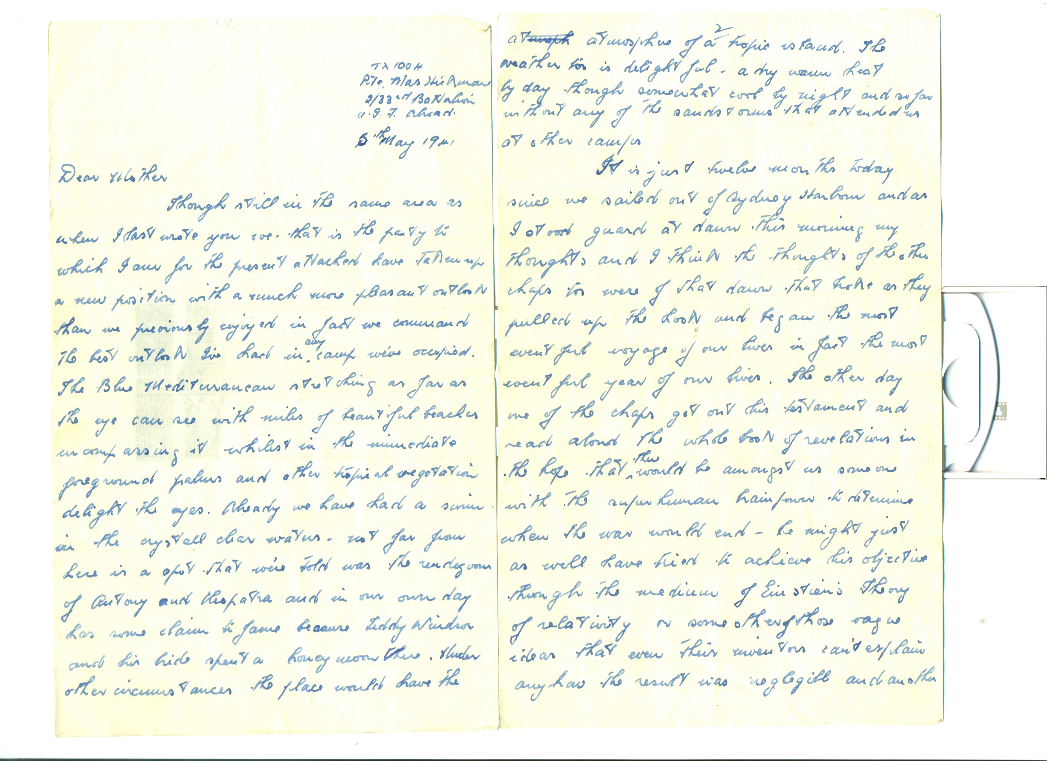 On Saturday afternoon I went over town with Betty. I had your brooch in my coat and had my eyes glinted for an Aussie. I told Betty if I saw an Aussie with your colours that I would speak to him about your battalion. Betty was horrified that I would speak to a strange soldier and was very disappointed when we saw none as she wanted to test me. She didn’t know how anxious I was for word of you.