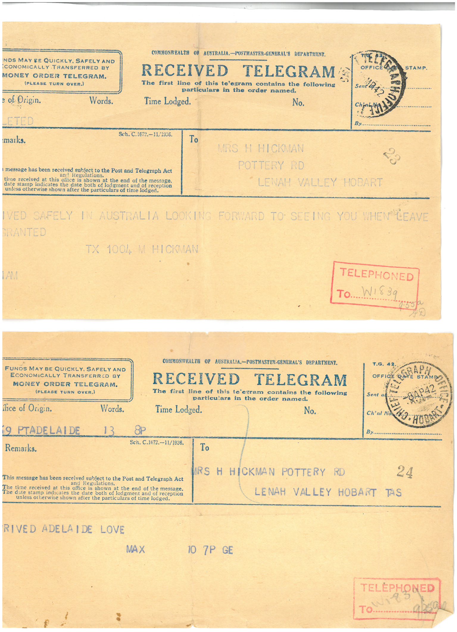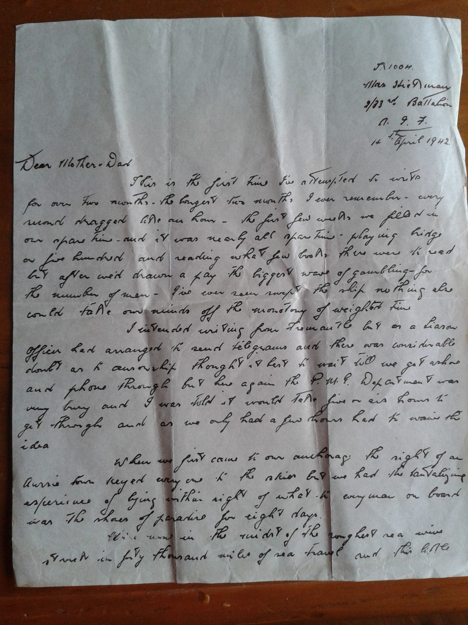 Your welcome letter of the 26th arrived on Thursday. The news about 109 Augusta Road was somewhat of a surprise. There’s no doubt about the security but I don’t like mortgages at the present time. Don’t you think money is too unstable for mortgages now? The war expenditure is so high that the relative value of money will have to be much lower after the war. The basic wage will have to be about ten pounds a week and everything else in proportion to ensure high enough taxes to meet the national commitments. Personally I think good land the best bet on the market today. You remember the boom that swept the country in building after the last argument – it will probably be the same after this and all the people who have put off building homes because of manpower regulations will be wanting land. It may not give any immediate return and will of course call up a bit in rates and taxes but values in and around Hobart must improve and alterations in home values will be reflected in land values. As you say – the war is getting closer with petty (?) bombings but they won’t beat us that way – the navy and airforce seem to have the weight of them in straight out fighting but it’s their coming that we’ve got to contend with.